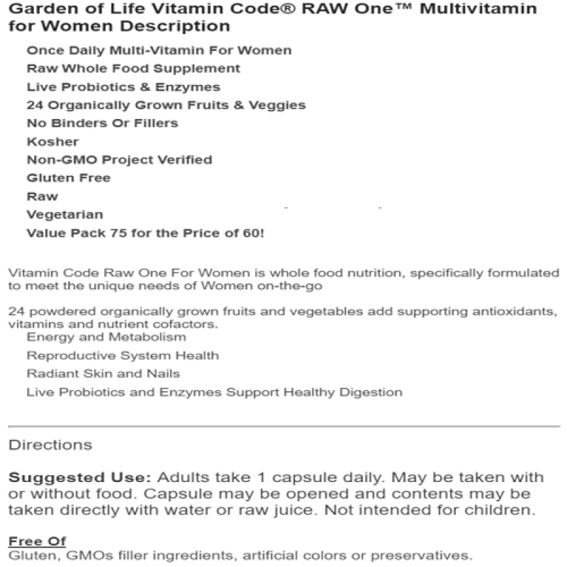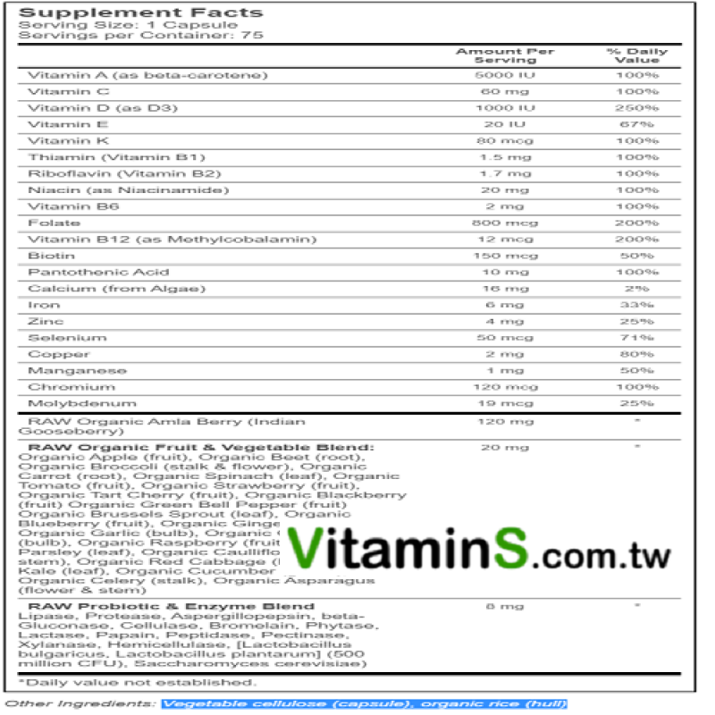 Garden of Life(生命花園)RAW One 女性綜合維他命 75粒素食膠囊 - -vitaminS維他代購