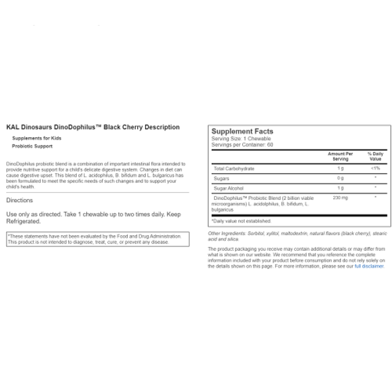 DinoDophilus益生菌混合物是重要的腸道菌群的組合,旨在為兒童的脆弱消化系統提供營養支持。 飲食變化會引起消化不良。 這種混合的嗜酸乳桿菌,雙歧桿菌和保加利亞乳桿菌經配製可滿足此類變化的特定需求並支持您孩子的健康。 使用建議:每天1顆黑櫻桃軟糖,或遵醫囑。 成份:如圖所示